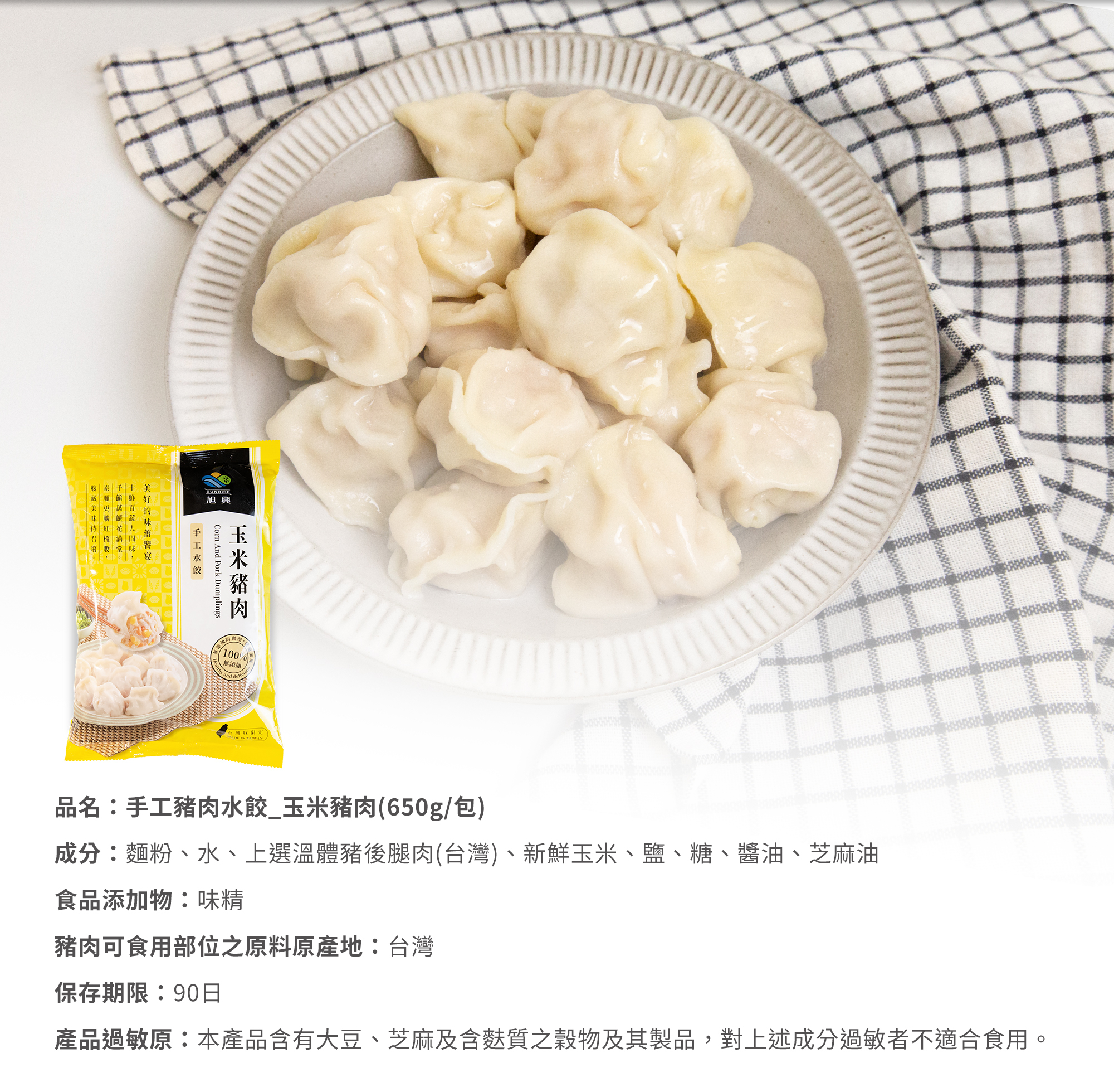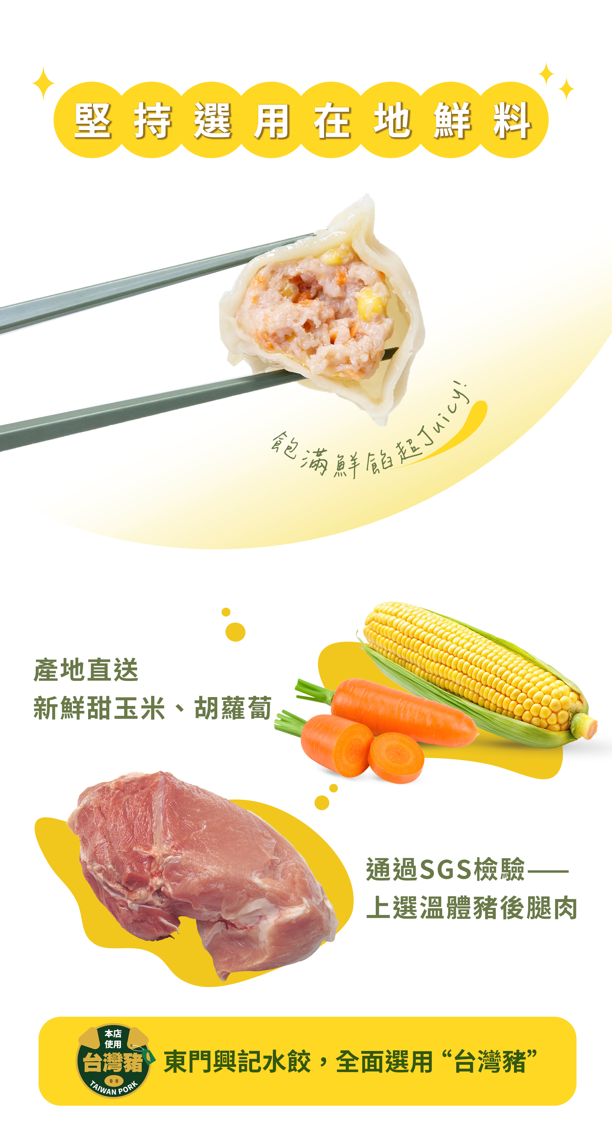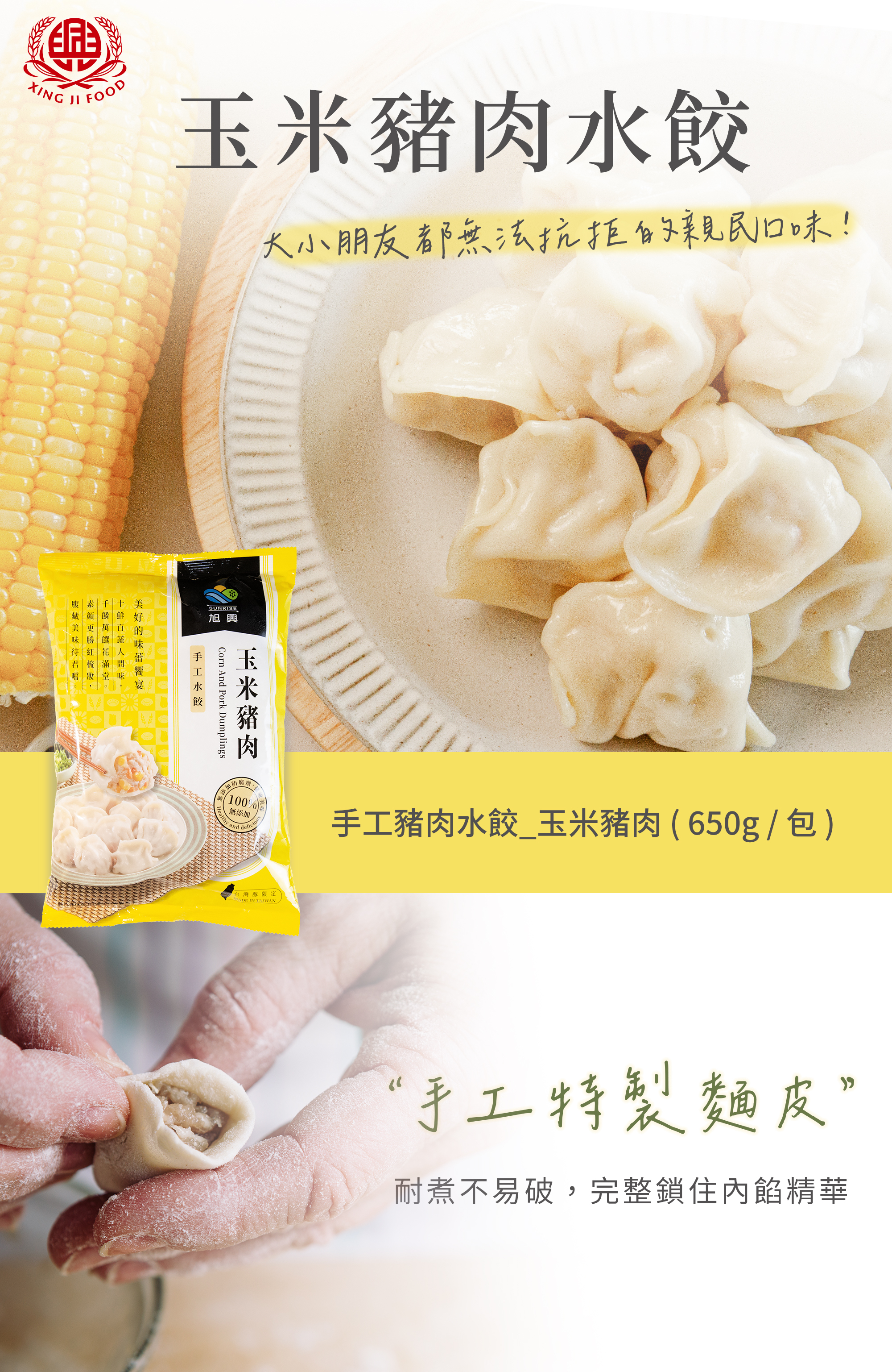 【玉米豬肉】是大小朋友都無法抗拒的親民口味!嚴選肉質細膩、口味清新無羶味的台灣豬,與玉米的自然甘甜交織、口感滑順,黃金玉米粒顆顆飽滿多汁,咬下清新香甜四溢,讓人一吃就愛上的療癒口感。